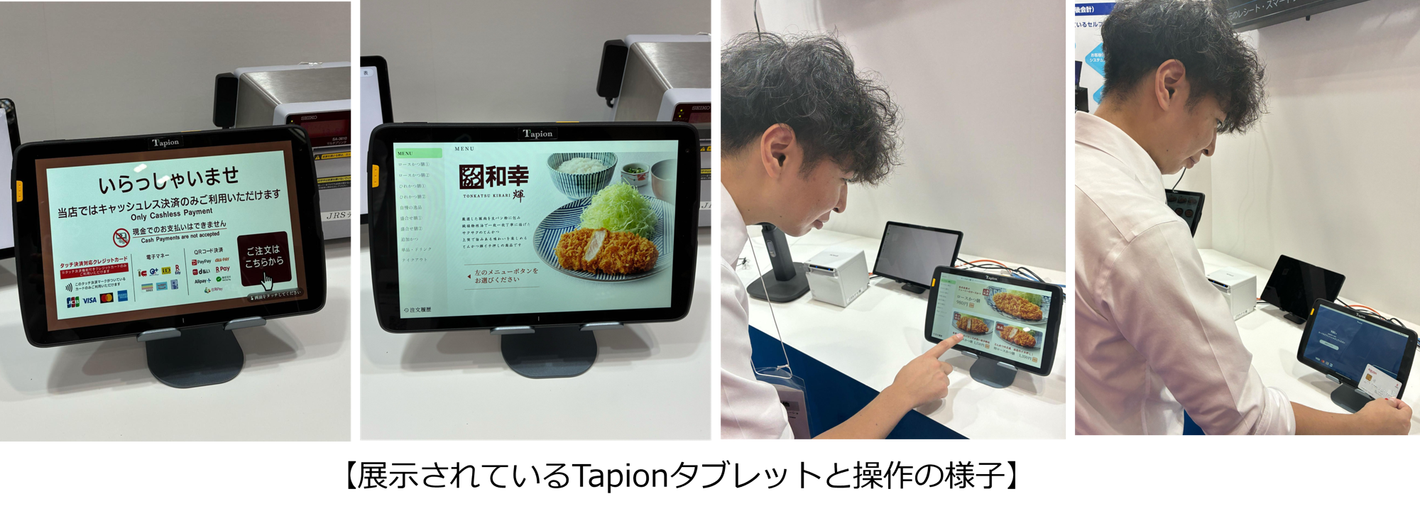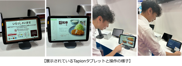 「Tapionタブレット」はPOSベンダーである日本リテイルシステム様の出展ブースにて展示されました。実店舗でのPoC(実証実験)に基づく日本リテイルシステム様の改良版として初公開され、セルフオーダーやセルフ決済が初めてのお客様でも直観的に操作しやすい仕様となっています。