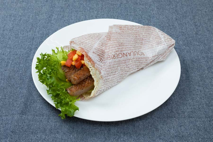 作品紹介:世界的に人気なメキシコ料理のもちもちブリトー生地に日本ならではの甘じょっぱい照り焼きソース味のこんにゃくと健康的な野菜をたっぷり巻いて頂けるブリトーです。