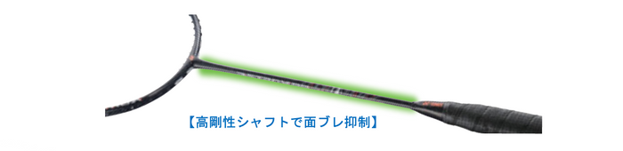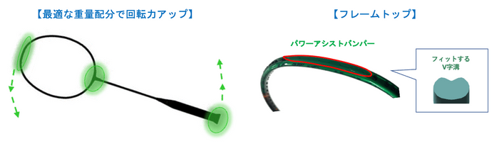 グリップエンド、フレームトップ、ジョイント部に重量を配分し強力な連続攻撃を実現。さらに「パワーアシストバンパー」がフレームトップに重量を追加し、空気抵抗を低減しながらシャトルへのパワー伝達を強化します。