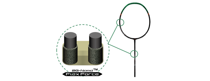 あわせて、素早いしなりとしなり戻りが特徴の先進カーボン素材「2G-Namd™ Flex Force※」をシャフト部とフレーム部に搭載し球持ちと球の出がアップ。また、エンドキャップを軽量化し、従来よりもヘッドヘビーの重量配分を実現。「最大ヘッドヘビーによるしなり増加」と「高剛性シャフトによる面ブレ抑制」の相乗効果により、手に伝わる打球情報の精度を高め、最大パワーのスマッシュを放つことができます。