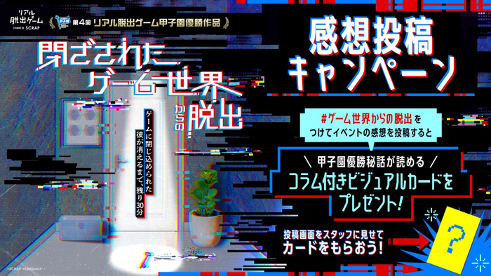 全世界で累計1,490万人以上を動員しているリアル脱出ゲームを企画制作する株式会社SCRAP(本社:東京都渋谷区、代表:加藤隆生)は、全国高校生リアル脱出ゲーム制作選手権(通称「リアル脱出ゲーム甲子園」)第4回優勝作品を、共同でリメイクした『閉ざされたゲーム世界からの脱出』のメインビジュアルを公開します。また、開催を記念した感想投稿キャンペーンも実施します。