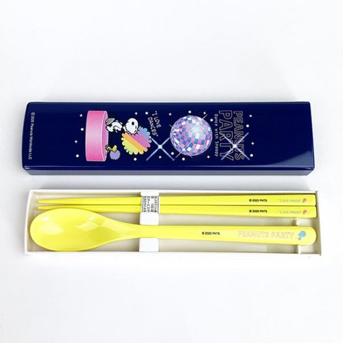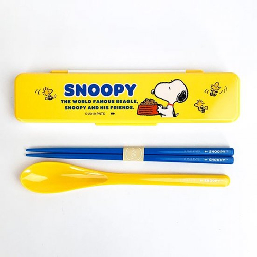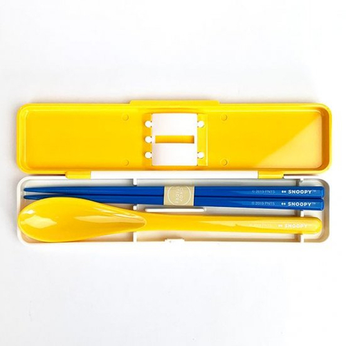 鮮やかなイエローカラーのケースに入った、お箸セットです。お皿を持ったゴキゲンそうなスヌーピーや、ウッドストックたちのデザインがとってもキュート♡中には、ブルーのお箸とともに、イエローのスプーンもセットされています。