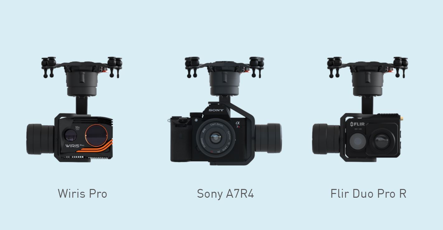 ASTROには60MピクセルのSony製 α7R IVと専用ジンバルが搭載できます。さらに今後は、Workswell社製サーマルカメラ WIRIS(R) Proや、FLIR社製 高解像度デュアルセンサー赤外線カメラ FLIR Duo(R) Pro Rと専用ジンバルを順次リリース予定です。