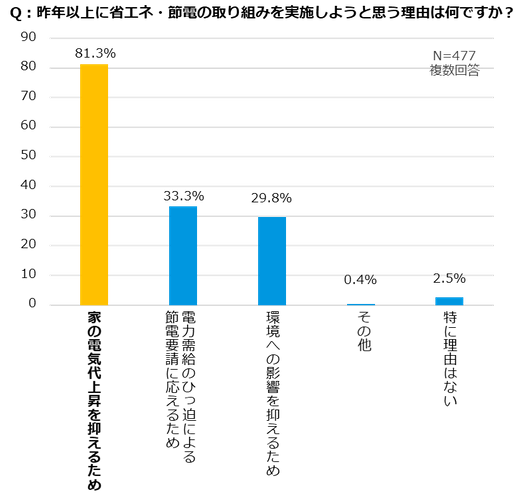 省エネ・節電に積極的に取り組む理由を聞いたところ、約8割(81.3%)の人が「家の電気代上昇を抑えるため」と回答し、他の項目を大きく抑えて最も多い結果となりました。節電要請に応えたい気持ちや、近年高まりつつある環境への意識がありつつも、現状では日常の生活と密接にかかわる「電気代の上昇」を強く意識している人が多いようです。