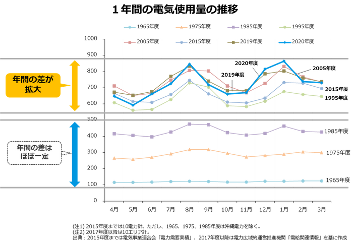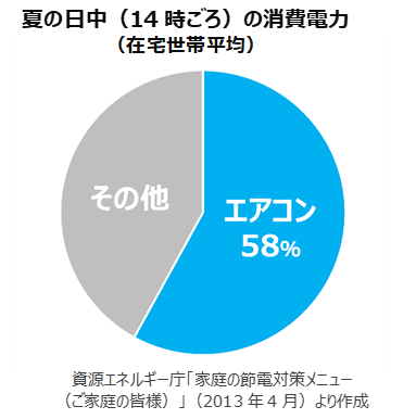 資源エネルギー庁の調査によると、夏の日中(14時ごろ)の一般家庭における電力消費は、照明や冷蔵庫を抑え、エアコンが最大(58%)で約6割を占めていると言われています。さらに、以前は、電気使用量は年間を通じてほぼ一定だったのが、近年、季節によってその差が拡大しています。夏と冬に電気使用量のピークを迎えていることから、季節によって使用頻度が大きく変わるエアコンも、夏場の電力需給に与える影響は大きいと考えられます。