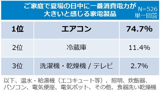 消費電力が大きいと感じる家電1位は「エアコン(74.7%)」 夏場の消費電力の約6割をエアコンが占めているが、 約8割の人はエアコンの消費電力を少なく見積もっている