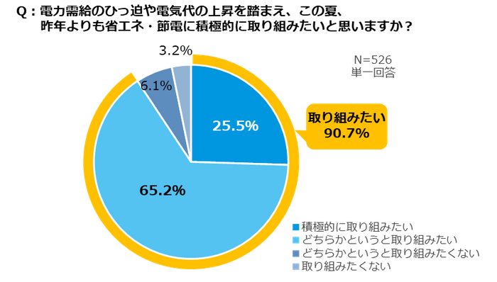 「この夏、昨年よりも省エネ・節電に取り組みたい」と回答した人は約9割(90.7%)と、大多数の人が省エネ・節電に積極的であることがわかりました。電力需給のひっ迫や、電気代の値上がりを背景に、この夏に向け、省エネ・節電に対する人々の意識は大きく高まっているようです。