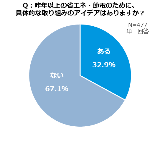 それでは、人々はどのよう省エネ・節電に取り組んでいこうとしているのでしょうか。「昨年以上の省エネ・節電のために、具体的な取り組みのアイデアはありますか?」との質問には、「ない(どうすればいいかわからない、これから考えたい)」と回答した方が約7割(67.1%)という結果となりました。近年の省エネ、環境意識の高まりの中で、すでにさまざまな形で省エネ・節電の工夫している人も多いことが考えられます。昨年以上の節電が難しい中、今まで取り組めていなかった新たな節電術に関する情報のニーズは大きそうです。
