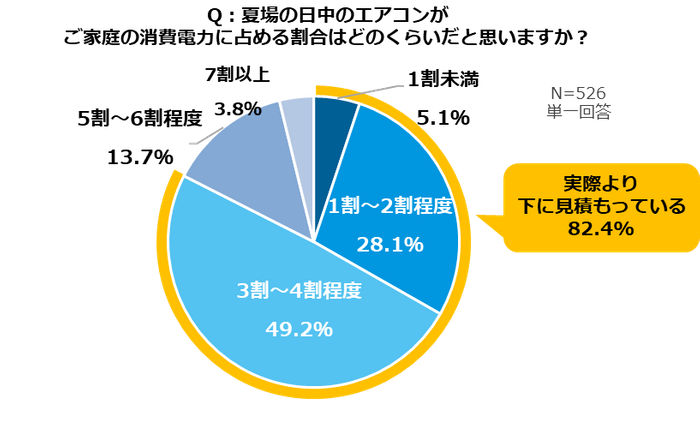 夏の電力需給に影響の大きいと考えられるエアコンの消費電力について、一般の方々には正しく理解されているのでしょうか。「夏場、一番消費電力が大きい家電」として約7割(74.7%)の人が「エアコン」と回答し、最も多い結果となりました。一方で、夏場の日中(ピーク時)におけるエアコンの消費電力の割合を「5~6割程度」と正しく回答できた人は約1割(約13.7%)と少なく、昨年同じ質問をした際 (13.4%)と大きく変わりませんでした。まだまだ多くの人がエアコンの消費電力を少なく見積もっているようです。エアコンの消費電力について正しい知識を身に着けることが、節電と環境貢献への第一歩かもしれません。