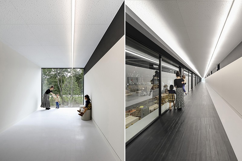 茨城工場は、木造住宅の骨組みとなる部材を加工する生産拠点です。単なる製造施設ではなく、「木材の加工プロセスそのものを建築化する」というコンセプトのもと設計されました。施設内には全長約100mのガラス張り見学通路を設置し、来場者が安全に工程を見学できる“見せる工場”として運用しています。また、事務棟には羽柄材を使ったトラス構造による大空間や、柱の端材を活用したデザインウォールを採用。構造体の柱や壁も木材現しとすることで、工場全体が木材建築の魅力を伝えるショーケースとなっています。