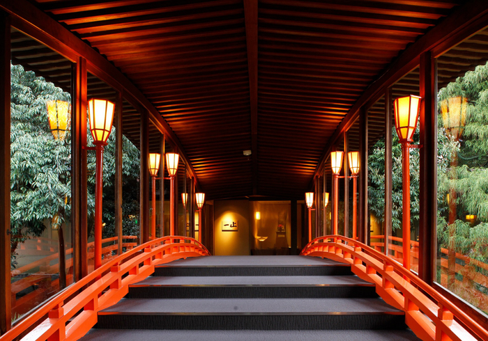 館内にある朱色の太鼓橋。ここから中庭の方に目を向けると、美しい紅色に染まる紅葉を眺められます。朱色の太鼓橋と美しい紅葉が一体となり、来館するゲストを迎えます。