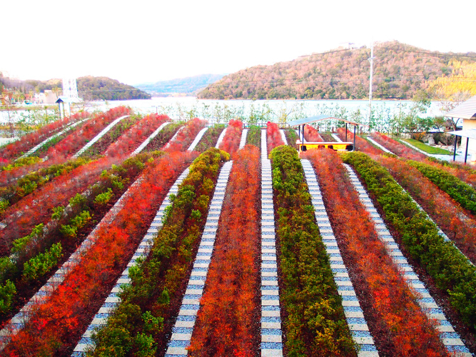 施設内にある「つむぎ茶畑」は、茶の木と交互に植えられたドウダンツツジが赤く色づき、まるで遠州綿紬の縞柄模様のように、赤と緑のコントラストを楽しめます。界 遠州の秋の風物詩です。