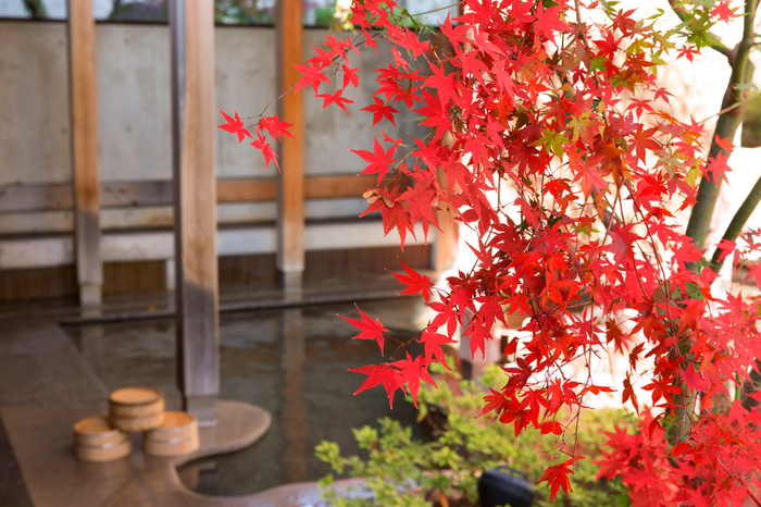 大浴場の露天風呂から、紅色に染まるもみじを眺めながら、湯浴みを楽しめます。また、ロータリーにある大きなもみじがゲストを出迎え、館内のフォトスポットとしても人気です。また、秋は地元塩尻産の希少なヌーヴォーを提供します。