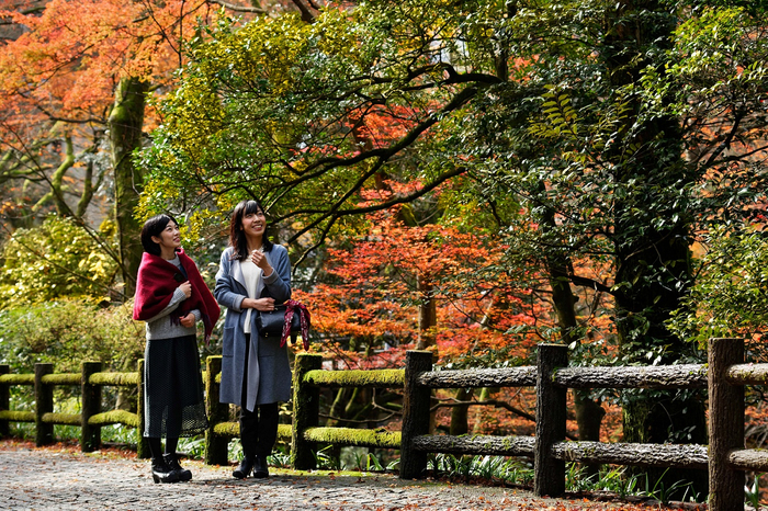 界 加賀より車で約15分の山中温泉に位置する鶴仙渓。砂岩の浸食によってできた風光明媚な自然の渓谷。2つの伝統的な橋の間に、川沿いの遊歩道やピクニック エリアがあり、散策をしながら紅葉を楽しむことができます。