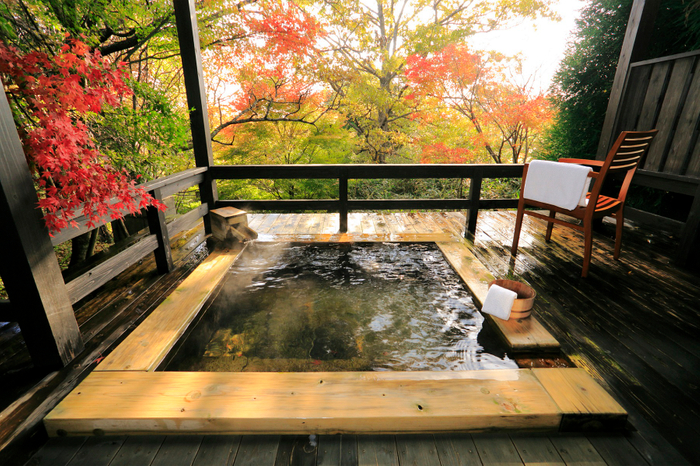 全室離れの客室に備えられた、森にせり出すようなテラスと温泉露天風呂では、国立公園の大自然と一体感を味わえる空間で湯船につかり、あざやかな紅葉を独占することができます。