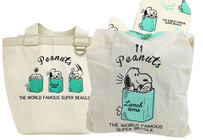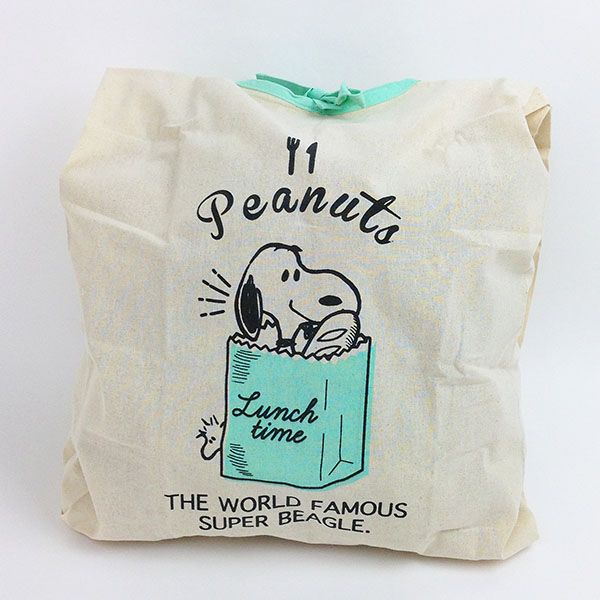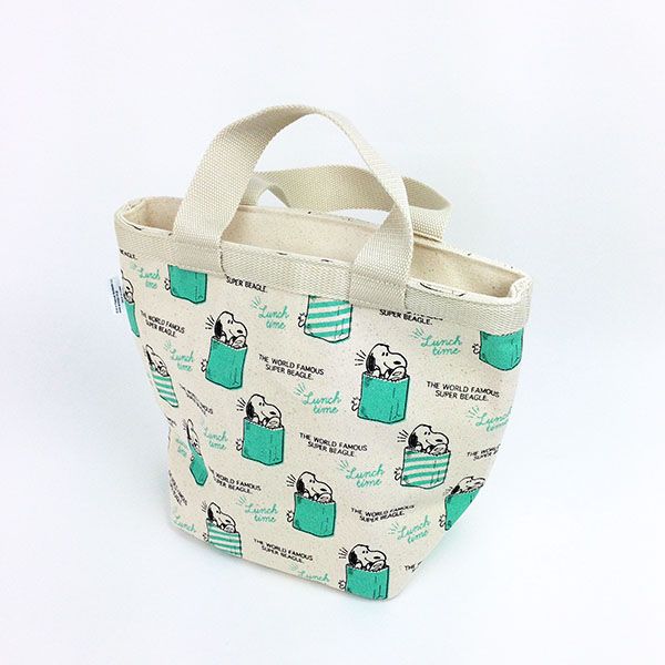 アイボリーのキャンバス地にミントカラーの紙袋に入ったスヌーピーが描かれています。逆さまになったスヌーピーまでいますね♪ウキウキしてくるような、楽しいデザインです。