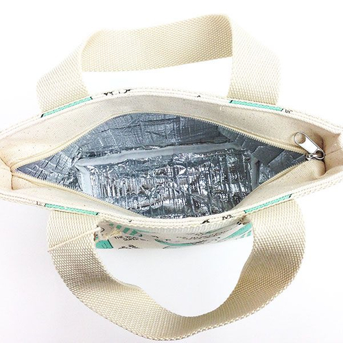 こちらは少し大きめのランチトートーです。27×34×15cmサイズで高さもあるので、ランチジャーやボトルも一緒に入れられますね。もちろん中はアルミで保温&保冷できます。