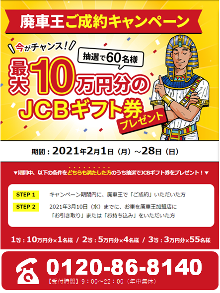 廃車買取の「廃車王」、抽選で最大10万円のJCBギフト券を プレゼントするキャンペーンを2月限定で実施!