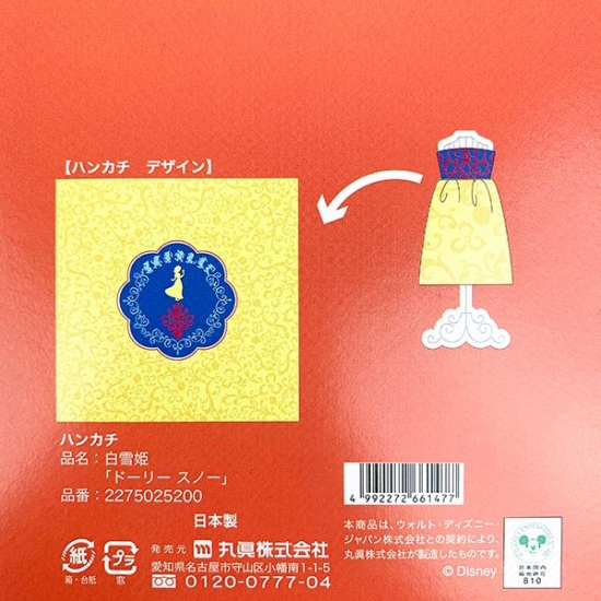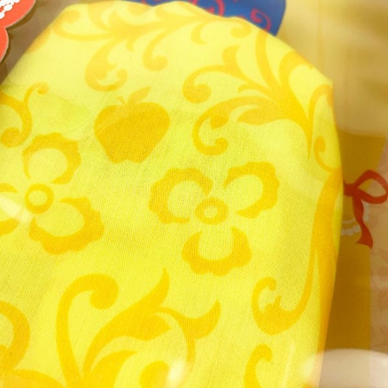 この、ブルーとイエローの配色を見ただけで、白雪姫だと分かっちゃいますね~♪ドーリースノーのハンカチには、小人たちと過ごす森の植物とともに、リンゴのモチーフも描かれています。