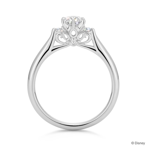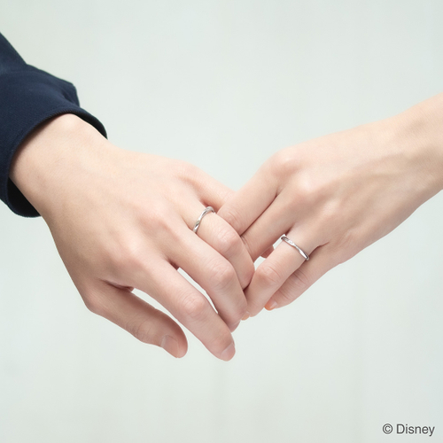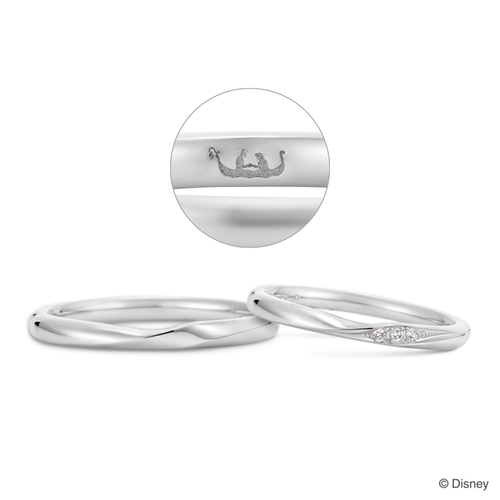 『塔の上のラプンツェル』の物語をモチーフに、婚約指輪は、「ラプンツェル」と「ユージーン」を結びつけたティアラを石座にデザインし、ふたりの強い絆を表現しています。結婚指輪は、ゴンドラのシーンから、ランタンの輝きが空へ舞い上がっていく様子をイメージしたデザインです。“幸せが広がっていくように”という想いを、斜めに留めた3ピースのダイヤモンドで表現しています。