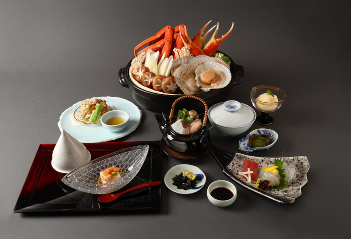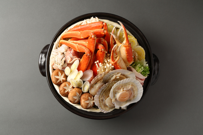 ズワイガニや北海道の帆立を含む贅沢な鍋料理で、土瓶蒸し茶漬けで〆ます。