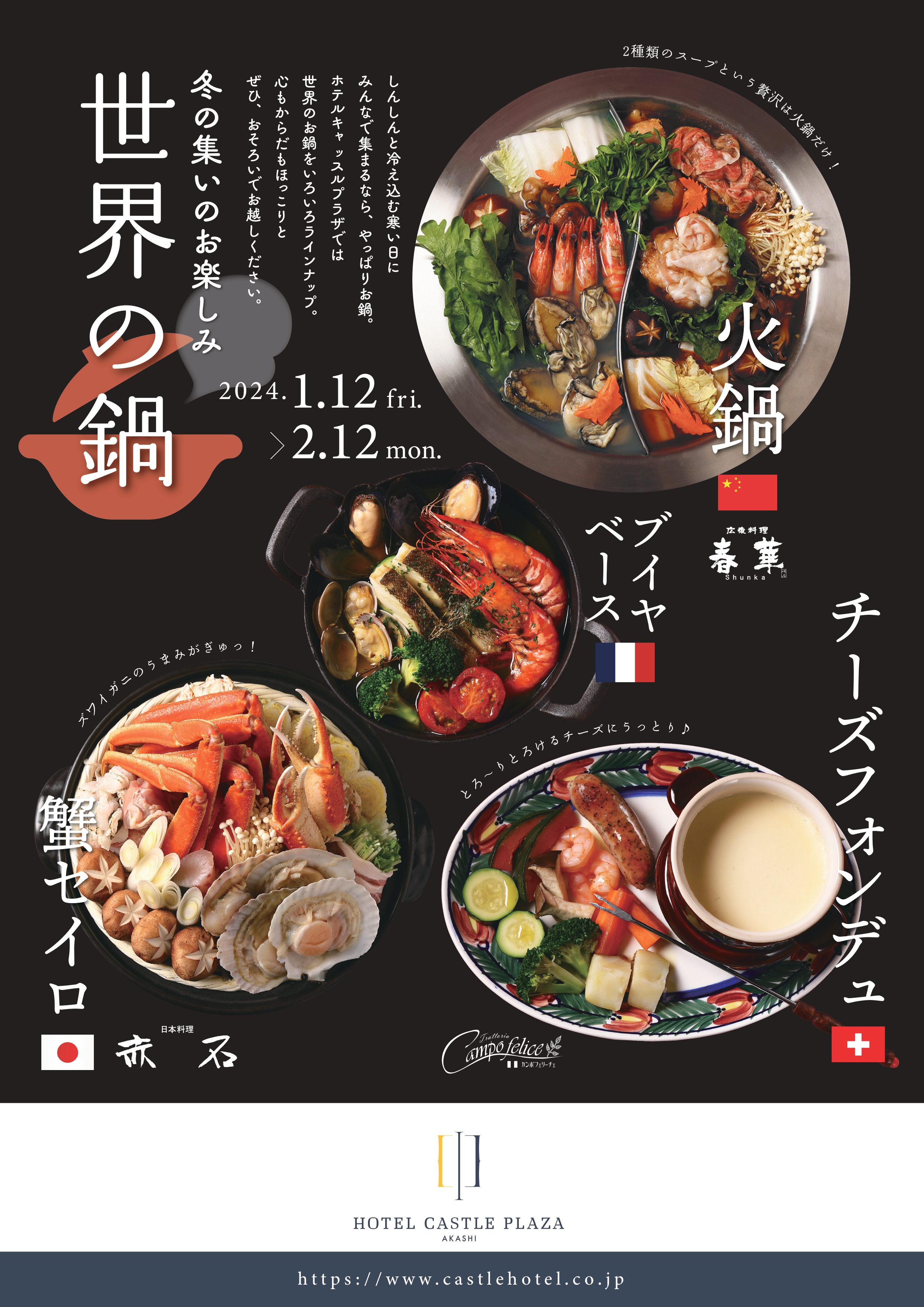 兵庫県明石市に本社を構える株式会社キャッスルホテル(社長: 成田良伸)は、2024年1月12日(金)から2月12日(祝)までの期間、JR西明石駅にほど近い系列ホテル「ホテルキャッスルプラザ」にて、和洋中のレストラン合同による特別企画「FourSeasons冬編」を開催します。今回のテーマは「冬にほっこり集う、世界の鍋フェア」と題し、各レストランが独自の魅力を凝縮した鍋料理を提供します。