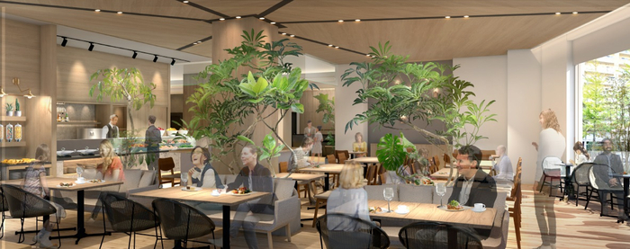 店内は、これまでレストランとロビーを区切っていた特徴的な壁面を取り払い、開放感あふれるオープンロビーレストランへ。店内中央には仙台市の市木である「ケヤキ」をイメージした柱が佇み、杜の都仙台を感じていただける木目調の柔らかく明るい空間へとリニューアルいたします。テーブル席の他にソファー席やカウンター席を設けることで、お客様の利用シーンに合わせたお席でゆっくりとお寛ぎいただけます。