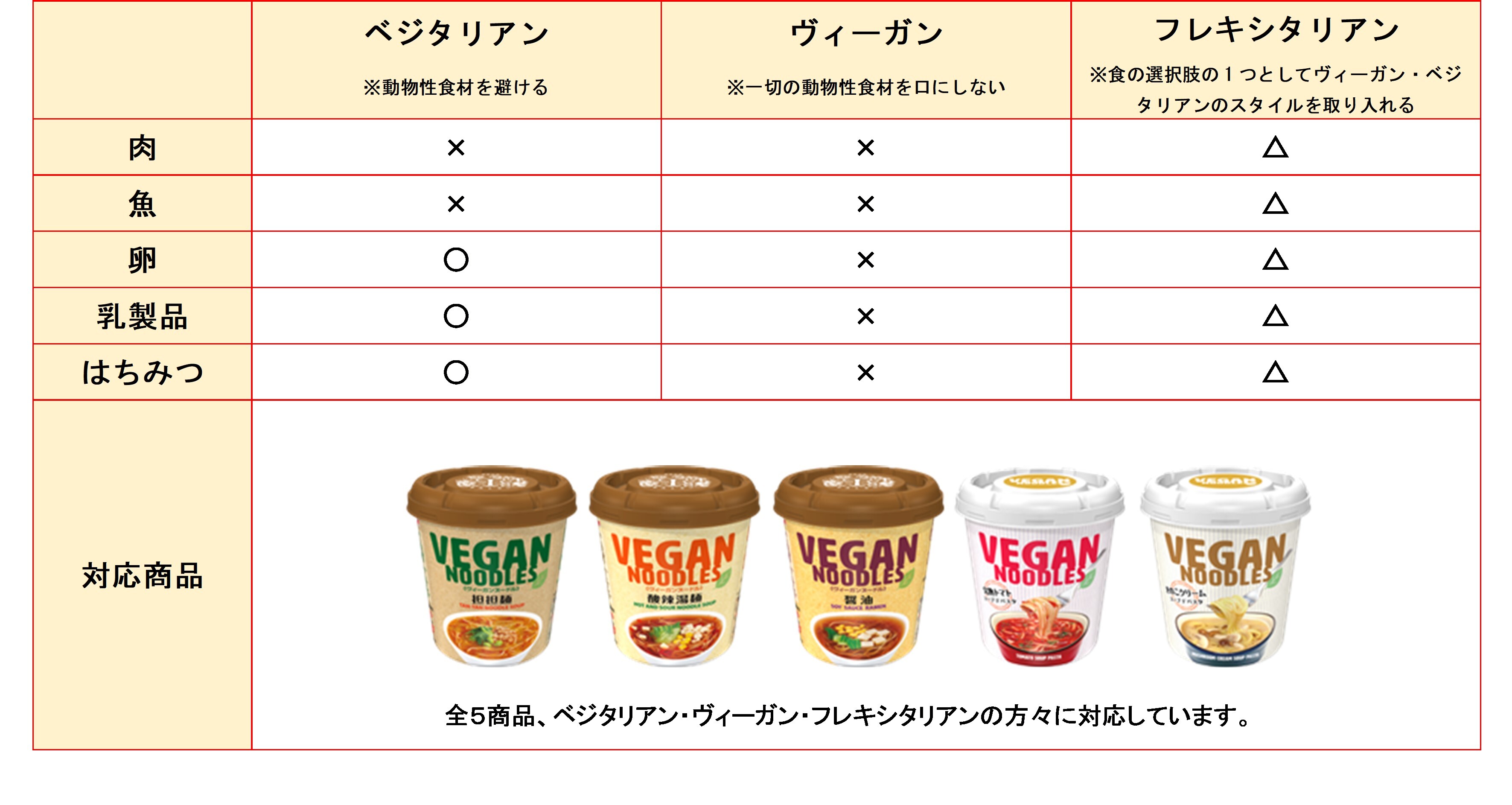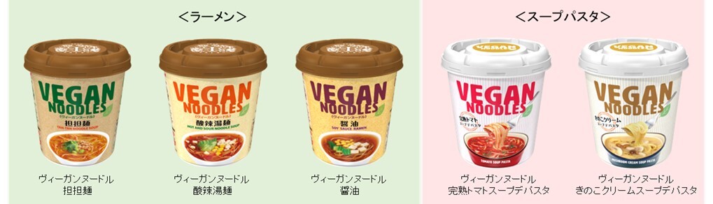 2015年の発売以降、「ヴィーガンヌードル」は、動物性食材・アルコール不使用のからだにやさしいカップ麺として、ヴィーガンの方をはじめ食事に制限のある方や卵・乳成分アレルギーをお持ちの方など、幅広いお客さまに好評をいただいております。 この度、ヴィーガンヌードルブランドに「完熟トマト」と「きのこクリーム」のスープパスタ2品が仲間入りしました。動物性食材不使用とは思えない濃厚なスープパスタを、ぜひお手軽にお楽しみください。