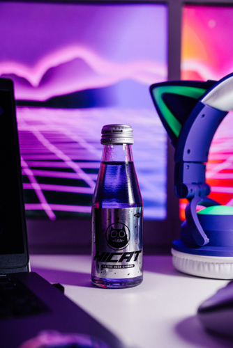 HICATは、2023年5月16日に販売を開始した、マタタビ配合のエナジードリンクです。(プレ販売は2022年12月より)瓶のボトルに紫色のドリンク、銀のラベルが特徴で、メタバース空間やデジタル感を意識した個性的なデザインになっています。フルーティーで飲みやすい微炭酸フレーバーで、カフェインを配合していないため、夜でも飲むことができます。蓋を開けた瞬間にひろがるハーブの香りにもこだわりました。