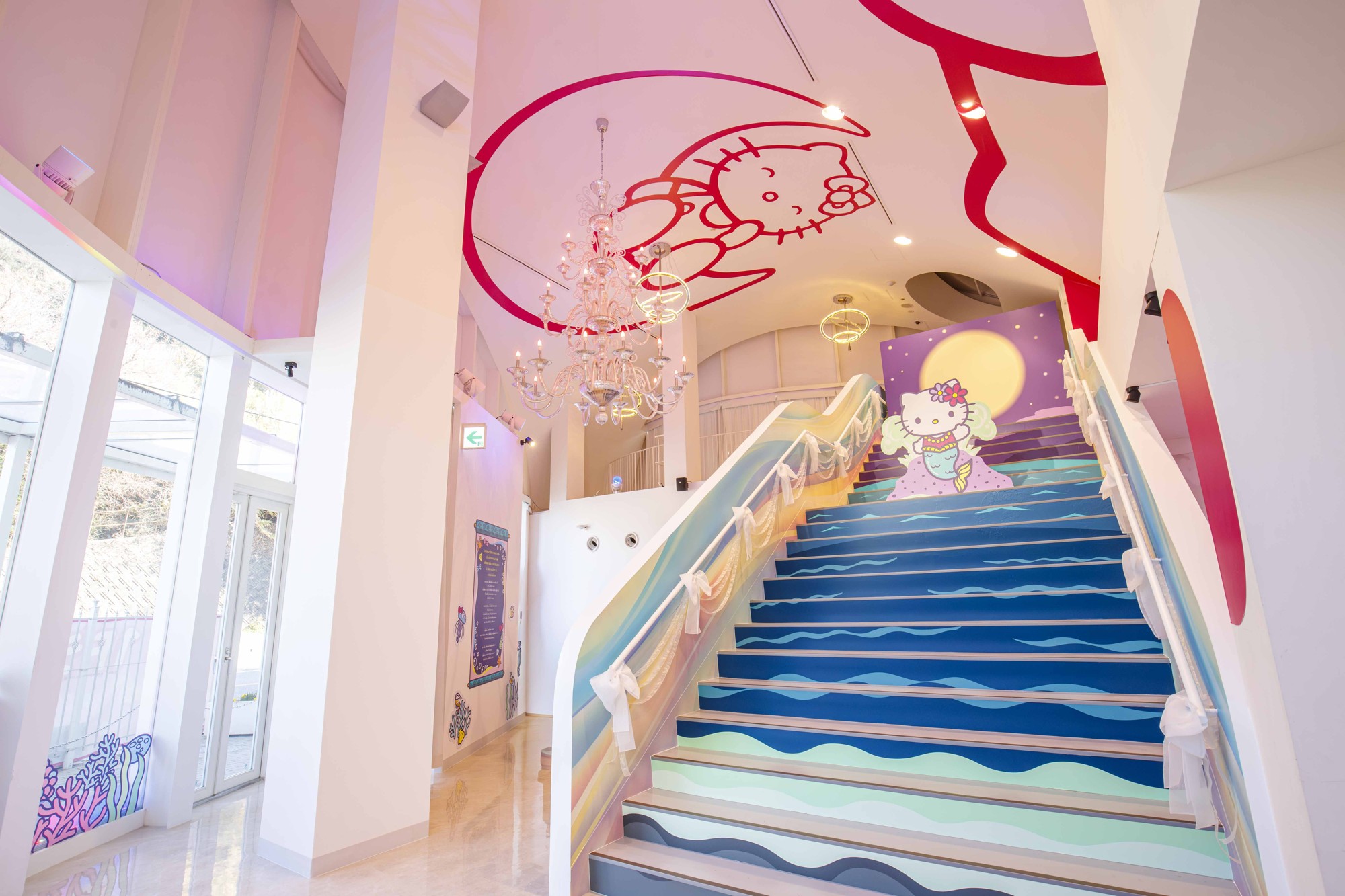 人魚姿のハローキティが来場者をお出迎え。波をモチーフにした大階段と一緒に写真を撮ろう!