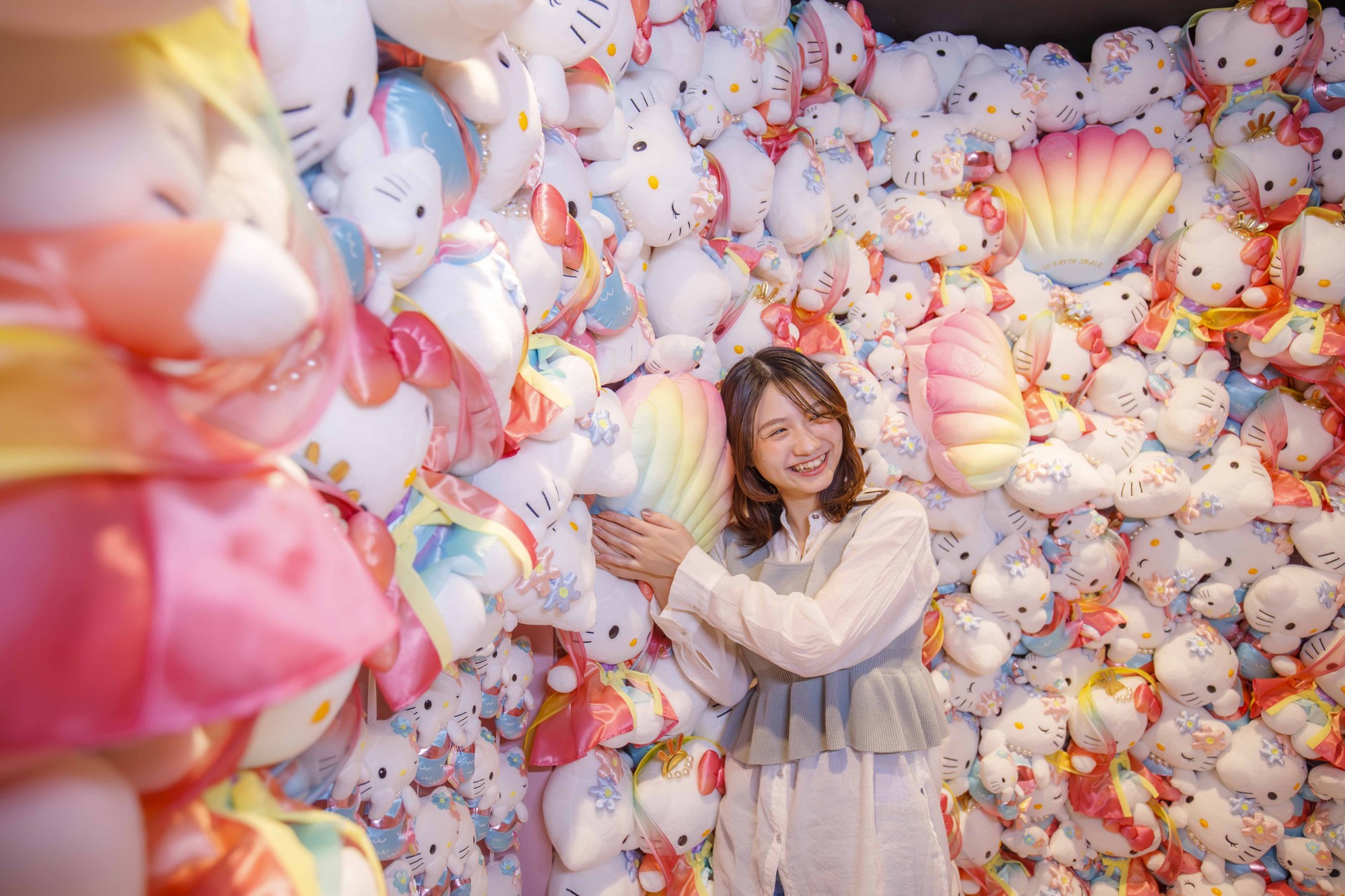 乙姫や人魚姿をしたハローキティのぬいぐるみに囲まれたフォトルーム。かわいいハローキティに囲まれた空間で、自分史上最高の“KAWAII”写真を撮っちゃおう!