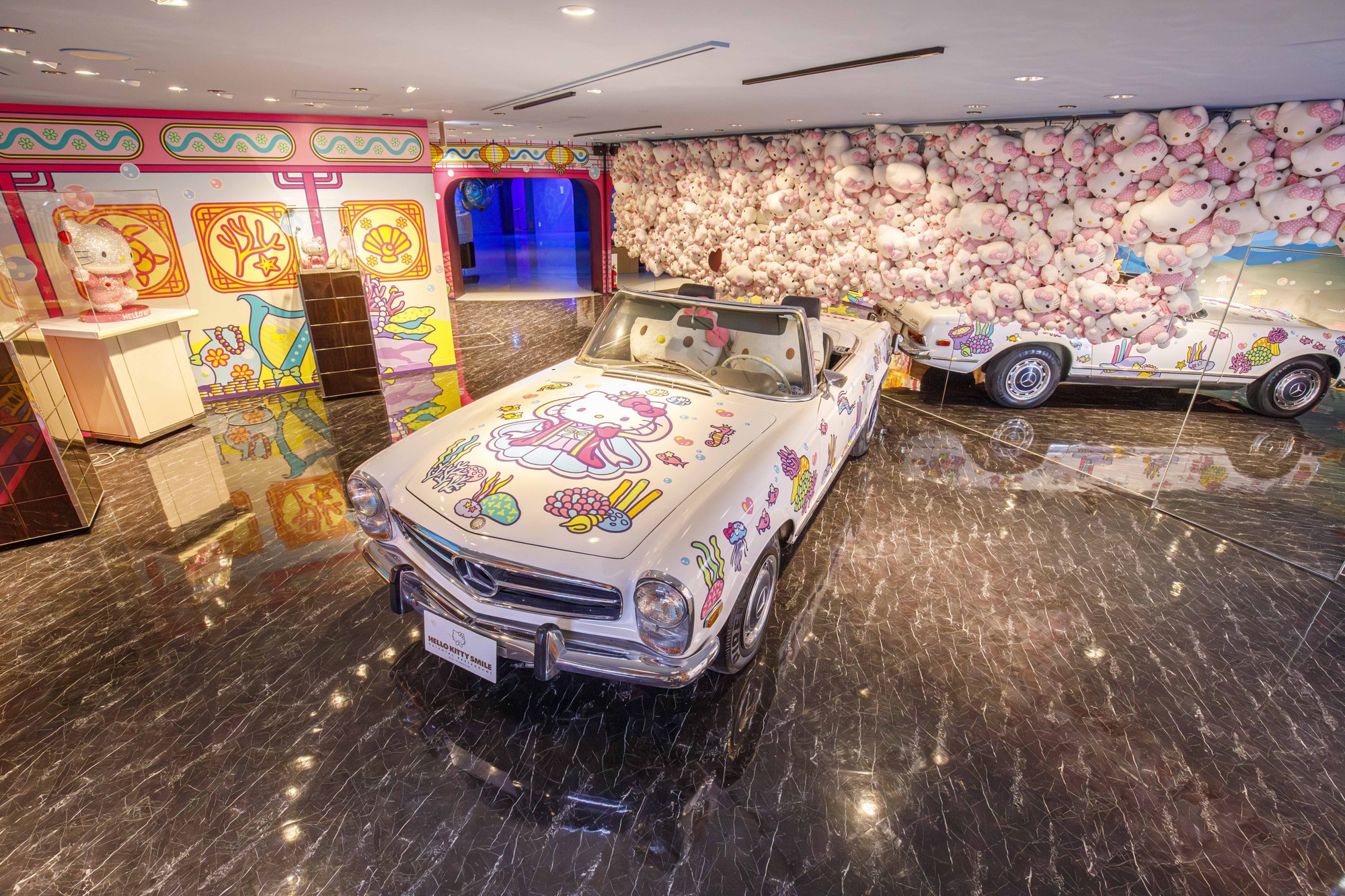 ハローキティとハローキティのボーイフレンドのダニエルが乗った車や全てにクリスタルがあしらわれた煌びやかでラグジュアリーなハローキティのフィギュアの展示など、360度どこを切り取っても写真映えする空間を演出
