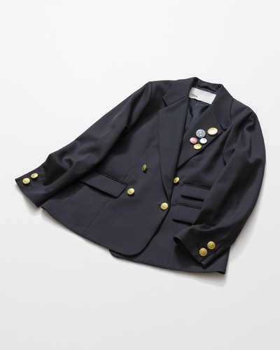 SHIPSを象徴するネイビーブレザーが、50周年を記念してトリプルコラボで登場。「TICCA(ティッカ)」のダブルジャケットをベースに、「manipuri(マニプリ)」製のSHIPSエンブレム柄の裏地や「S」の刻印ボタンを採用しました。50周年にちなんだ5種類の缶バッチを付属し、時代を超えて愛されるデザインに特別な要素を加えた一着です。