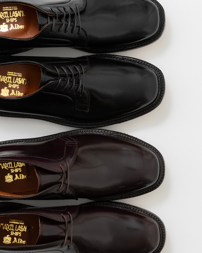 フレンチトラッドを代表するブランドであり、現在はSHIPSがエクスクルーシブで展開する〈MARCEL LASSANCE (マルセル ラサンス)〉。同ブランドがかつて別注して話題となった〈ALDEN (オールデン)〉で、現在では希少なケンドールラストが採用されたプレーントゥとチャッカブーツを復刻。スクエアトゥがミニマルでコンチネンタルな雰囲気を纏ったモデルです。アッパーは言うまでもなくホーウィン社のシェルコードバン。インソールには3社のロゴが刻印され、語り継がれる希少な名品が再び誕生しました。
