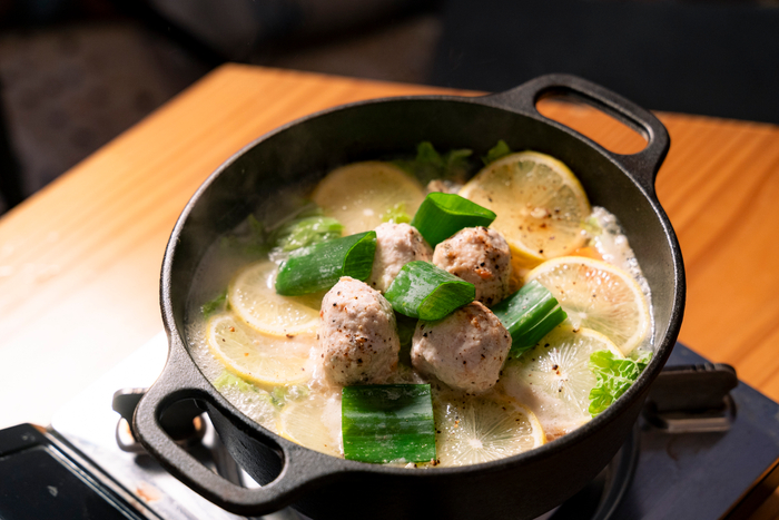 手作りの鶏つくねがゴロッと入ったお出汁香るお鍋と、爽やかなレモンの酸味がマッチした味わいとなっています。この特別なメニューを食べられるのは、SPACOをご利用の方限定です。