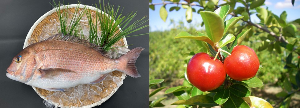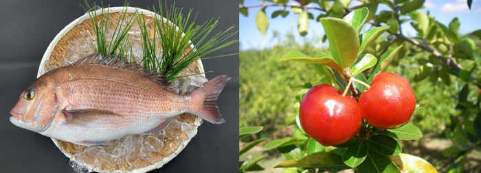 アセロラ果汁の生産過程で発生する搾りかすには、アントシアニン系のポリフェノールとビタミンCが多量に含まれており、これを養殖魚の食味と色の改善に役立てようと、ニチレイグループと近畿大学が、アセロラ由来のポリフェノールとビタミン類の抗酸化作用による後味の良さの向上と品質の保持(肉質の保持や色味の保持)を期待して2018年から共同研究を開始、アセロラの搾りかす粉末を配合した餌で養成した養殖真鯛である「アセロラ真鯛®」の開発に成功しました。