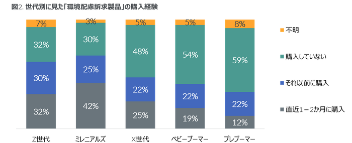 環境配慮製品の購入経験は若い世代において高く、Z世代で62%、ミレニアル世代で67%となっている。半面、X世代以上の層においては半数以上で購入経験がなく、世代が上がるほどに購入経験の減少がみられる。