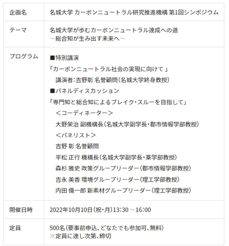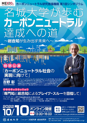 本機構の第1回シンポジウムとして「名城大学が歩むカーボンニュートラル達成への道~総合知が生み出す未来へ~」をテーマに、名誉顧問である吉野彰終身教授による特別講演、また総合大学である名城大学のカーボンニュートラル研究についてパネルディスカッションを行います。