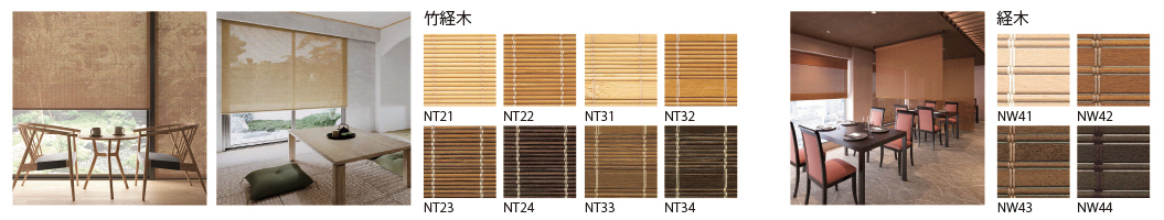 竹経木(2タイプ8アイテム)は、和モダンな空間や和室、宿泊施設、店舗にあわせやすいラインアップ。経木(4アイテム)は、天然木の重厚感が落ち着いた雰囲気の空間や伝統的なお部屋にぴったりです。