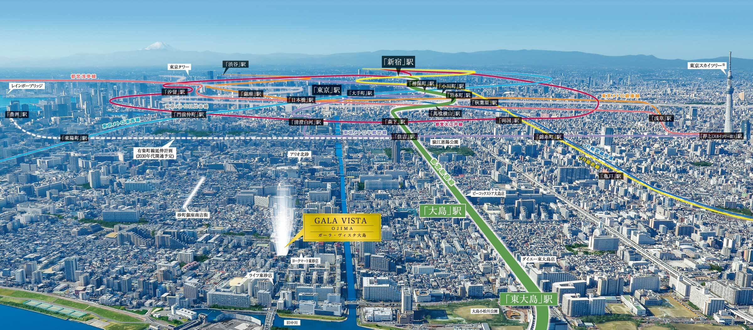 最寄りの都営新宿線急行停車駅「大島」からは、「東京」「大手町」「日本橋」駅といった都心主要エリアへの快適なアクセスを実現するほか、ビッグターミナル「新宿」駅までダイレクトに繋がるなど、卓越したアクセスネットワークを誇ります。都内を縦横無尽に駆け巡る交通利便性が魅力です。