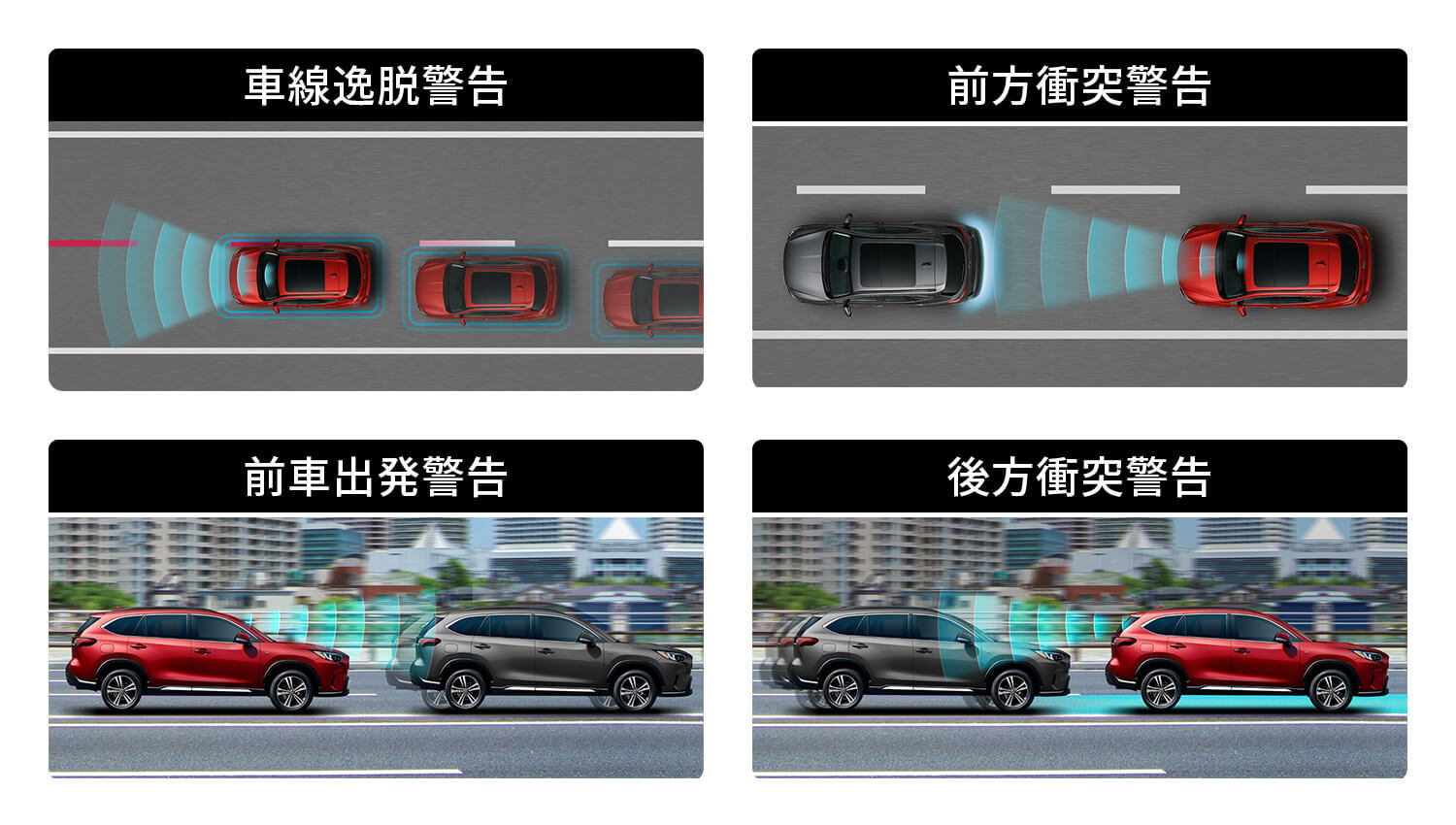 「車線逸脱警告」、「前方衝突警告」、「前車出発警告」、「後方衝突警告」といった先進運転支援機能(ADAS)を搭載。車線の逸脱や前方車両への急接近、前車の発進、後続車からの急接近などを検知し、警告音でドライバーに注意を促します。