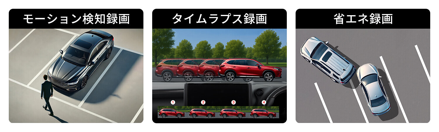駐車監視は、「モーション検知録画」「タイムラプス録画」「省エネ録画」から選択可能です。