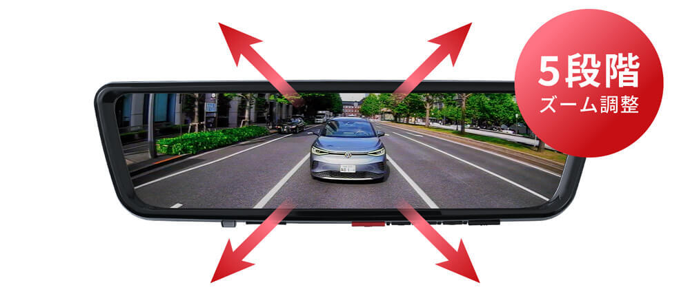 リアカメラの映像を5段階で拡大表示可能。後続車との距離感をつかみやすくなり、高速走行時や夜間の安全確認にも役立ちます。