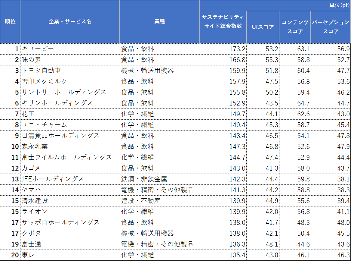 サステナビリティサイトランキングトップはキユーピー、2位は味の素、3位はトヨタ自動車となりました(順位は調査対象全100社中)。