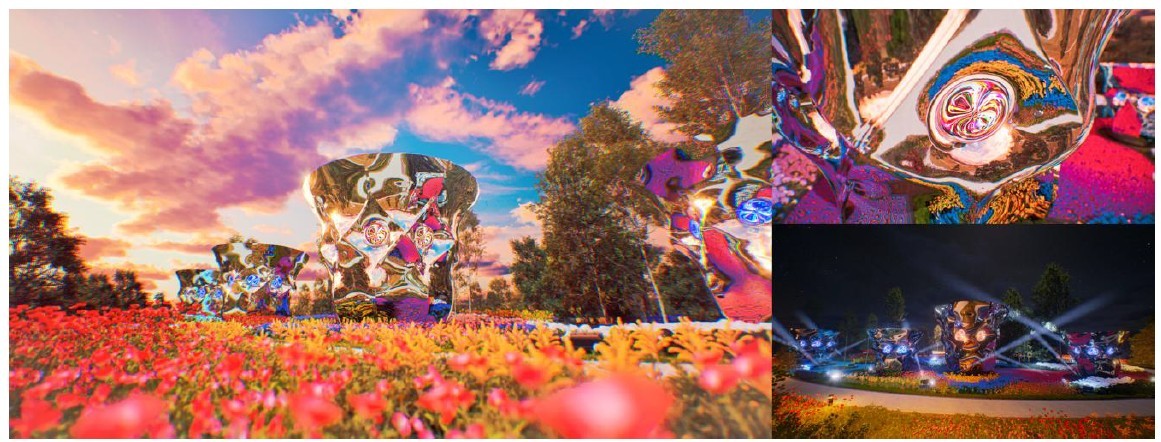 「null⁴」は、「null²」が自然の中で転生して生まれた風景変換彫刻であり、GREEN×EXPO 2027会場内SATOYAMA Villageの中に設置される予定です。null²と同様にプロデューサー落合陽一の「シグネチャー」作品として、花壇の花・空・風・来場者の影を回転する鏡面に取り込み風景を変換する彫刻であり、同時に計算機自然の生命彫刻としてインタラクティブに空間と感応します。