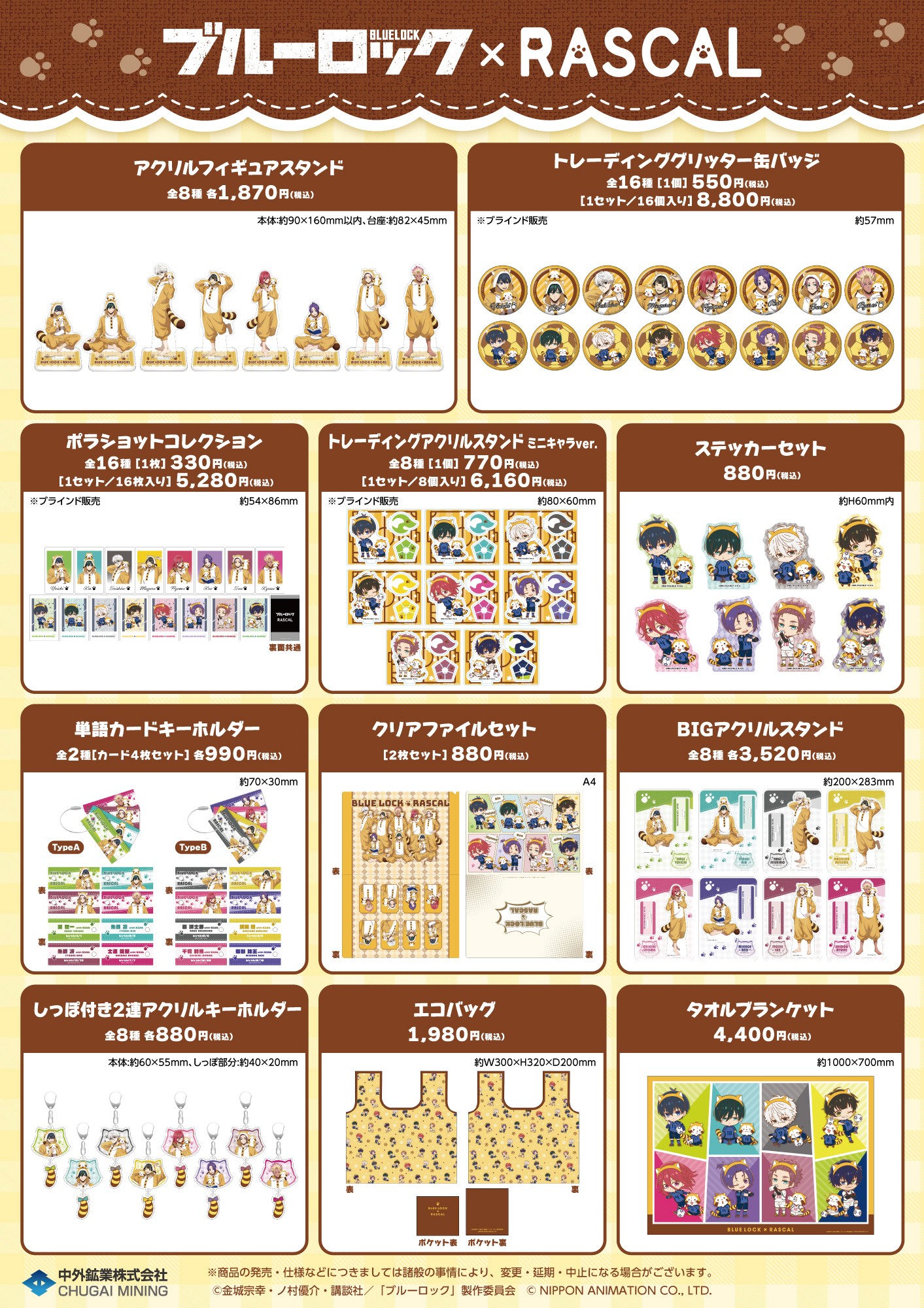 今回のコラボレーションに合わせて、『ブルーロック』とラスカルのコラボレーションイラストを新たに作成しました。 「ブルーロック×RASCAL POP UP SHOP in OIOI」では、着ぐるみ姿でラスカルと戯れる潔たち8人の描き下ろしイラストを使用した「アクリルフィギュアスタンド」や「しっぽ付き2連アクリルキーホルダー」、かわいいミニキャライラストを使用した「タオルブランケット」など新作アイテムが多数登場します。