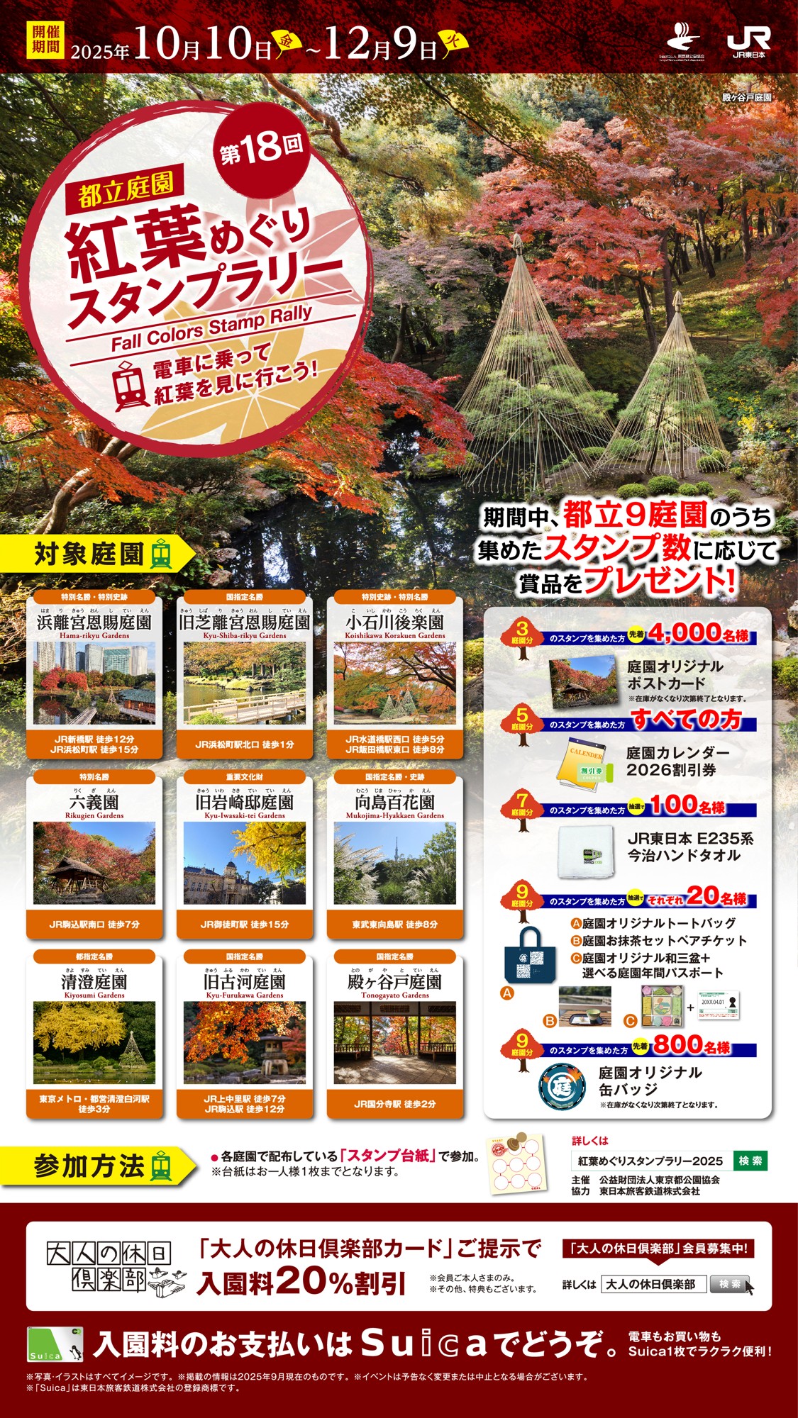 都立9庭園にて10月10日(金)~12月9日(火)に開催する第18回「都立庭園紅葉めぐりスタンプラリー」にて5庭園分のスタンプ取得で、上記カレンダーを300円(税込)でご購入いただける割引券をプレゼントいたします。その他にも賞品がございますので、ぜひ秋の都立庭園をお巡りください。