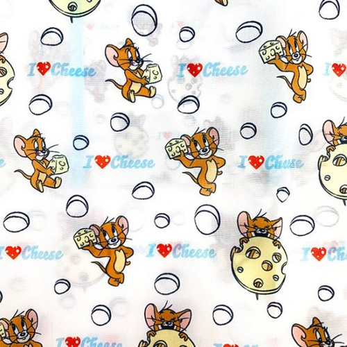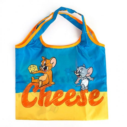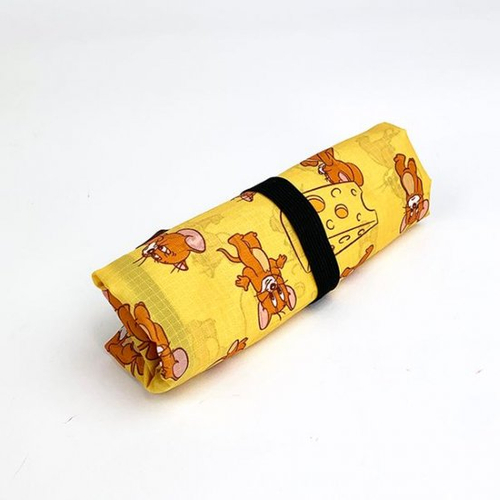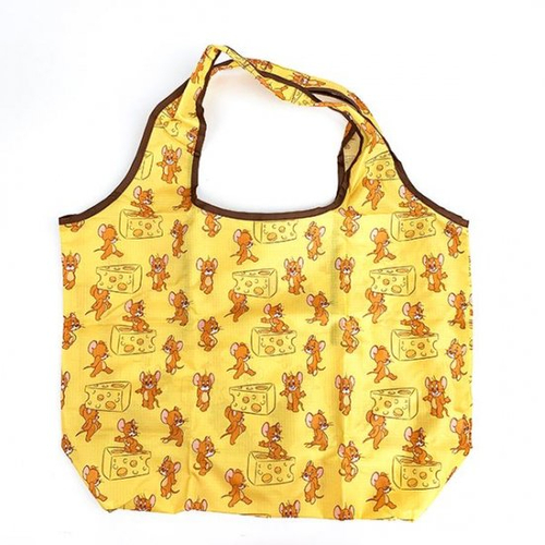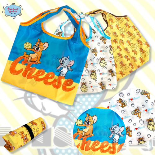 こちらは、イエロー地にジェリー&チーズデザインのエコバッグです。チーズの上に乗っかったり、いろいろなポーズのジェリーが総柄になっていてオススメのデザイン♪