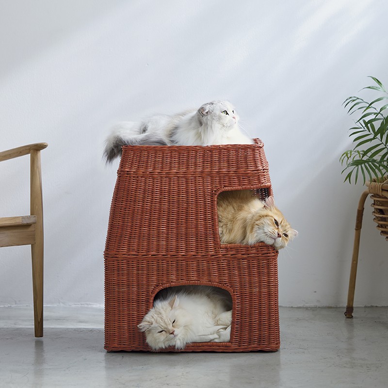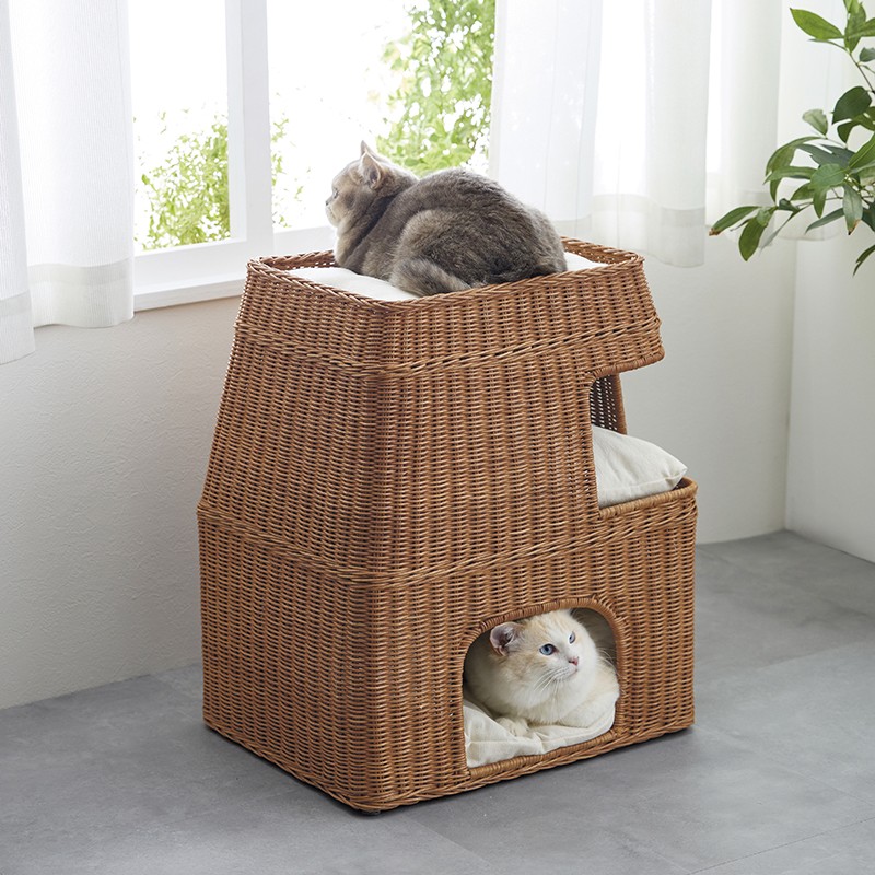 暑い季節を涼やかに過ごせる猫用ハウスとして、「3階建てラタン キャットハウス」も新たに販売します。通気性に優れた天然ラタンを使用した編み込みベッドで、3段のスペースに分かれているため、多頭飼いのご家庭でも使いやすい設計です。熟練の職人がひとつひとつ丁寧に編み上げており、天然素材ならではの風合いと、家具のように空間になじむ佇まいも魅力です。クッション付きで、猫がそれぞれのスペースでゆったりくつろげる仕様となっています。