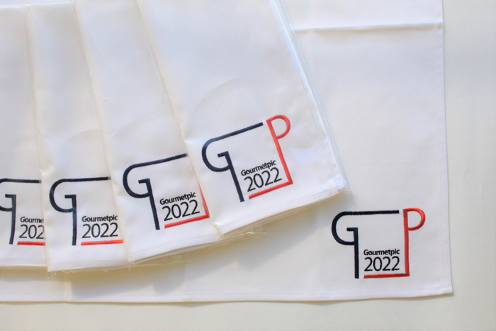 ロゴマークが右下に刺繍されたトーションを配布します。